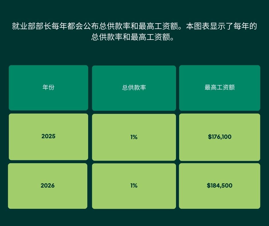 - 雇有25名或更多员工的大型雇主必须缴纳总供款率(2026年设置为1%)的 40%,最高至每位员工,每年的社会保障工资指数184,500 美元。