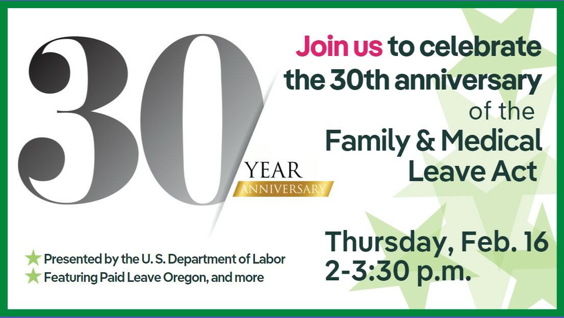 Family and Medical Leave Act (FMLA) is turning 30! Join Paid Leave Oregon as we celebrate this important milestone program with U.S. Department of Labor, BOLI, and Family Forward by discussing the history of the program, how it works between Federal and State laws, and the implications in your state.