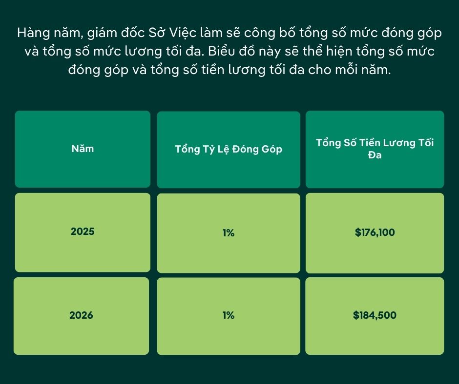 - Những công ty-doanh nghiệp lớn có từ 25 nhân viên trở lên phải trả 40% tổng tỷ lệ đóng góp (được đặt ở mức 1% cho năm 2026), tối đa $184,500 đô la dựa trên bảng chỉ số tiền lương của an sinh xã hội cho mỗi nhân viên, mỗi năm.
